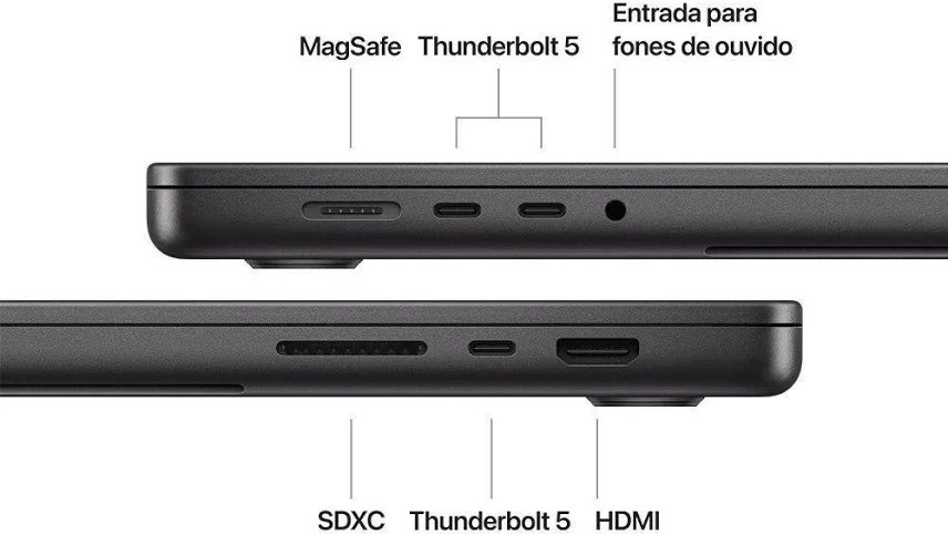 O chip M4 Max transforma o MacBook Pro em uma potência absoluta. Você nunca imaginou tanta velocidade e recursos. O desempenho da CPU é excepcional em uma ou múltiplas threads, a memória unificada é mais rápida e os aceleradores de aprendizado de máquina foram aprimorados. O poderoso Neural Engine faz tarefas de IA, como redimensionamento de imagens e criação de legendas de vídeo, simplesmente voarem.